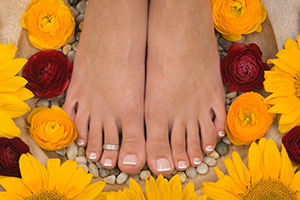 Trim, file, cuticle clean up, sugar scrub, foot mask, hot towel, oil massage with two hot stones